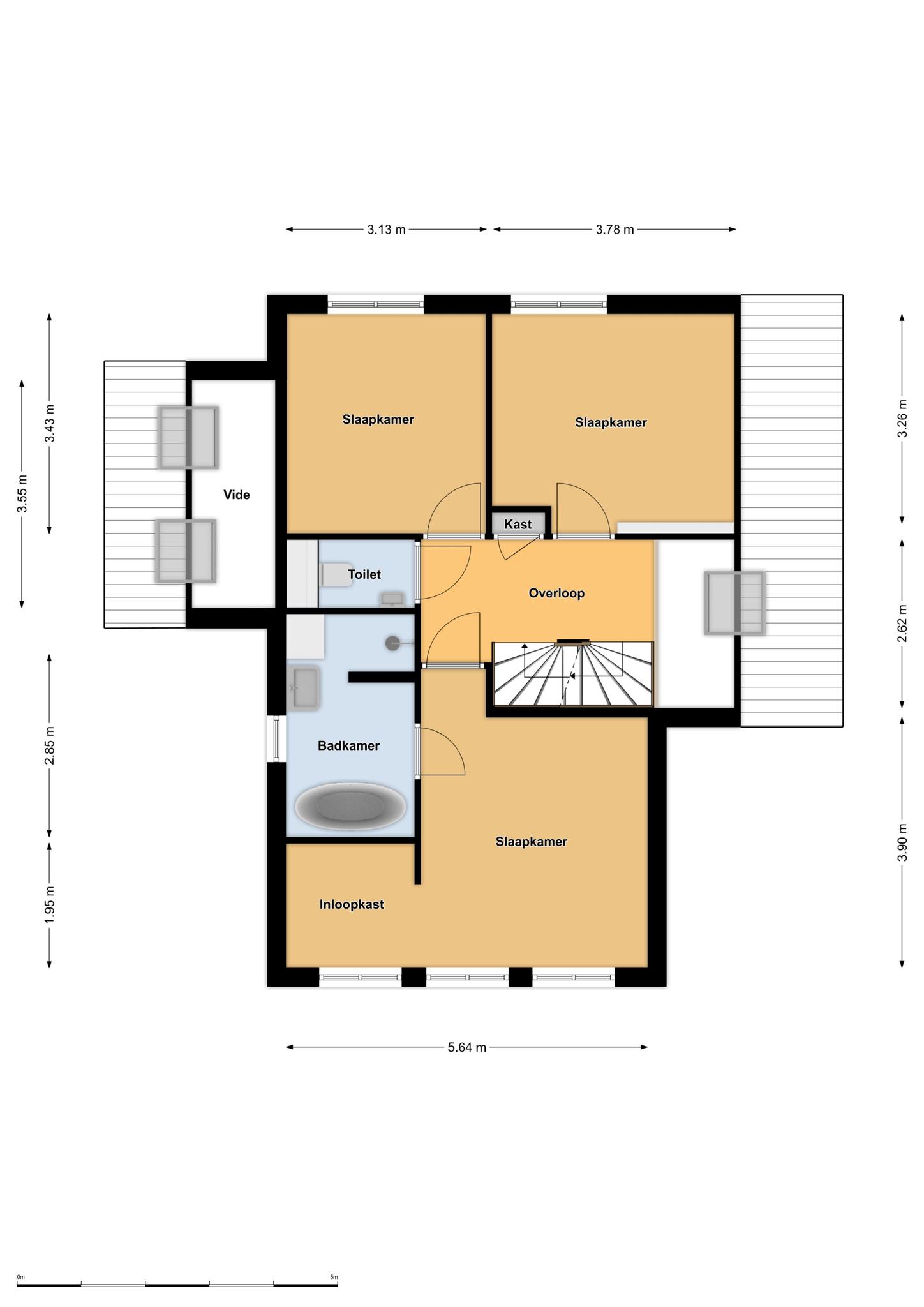 Overloop, separaat tweede toilet, hoofdslaapkamer met inloopkast en eigen badkamer, tweede en derde slaapkamer.