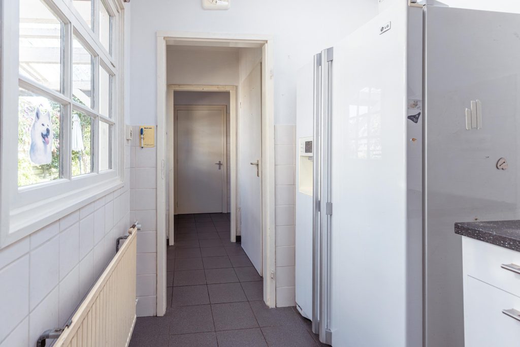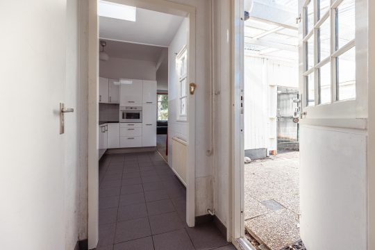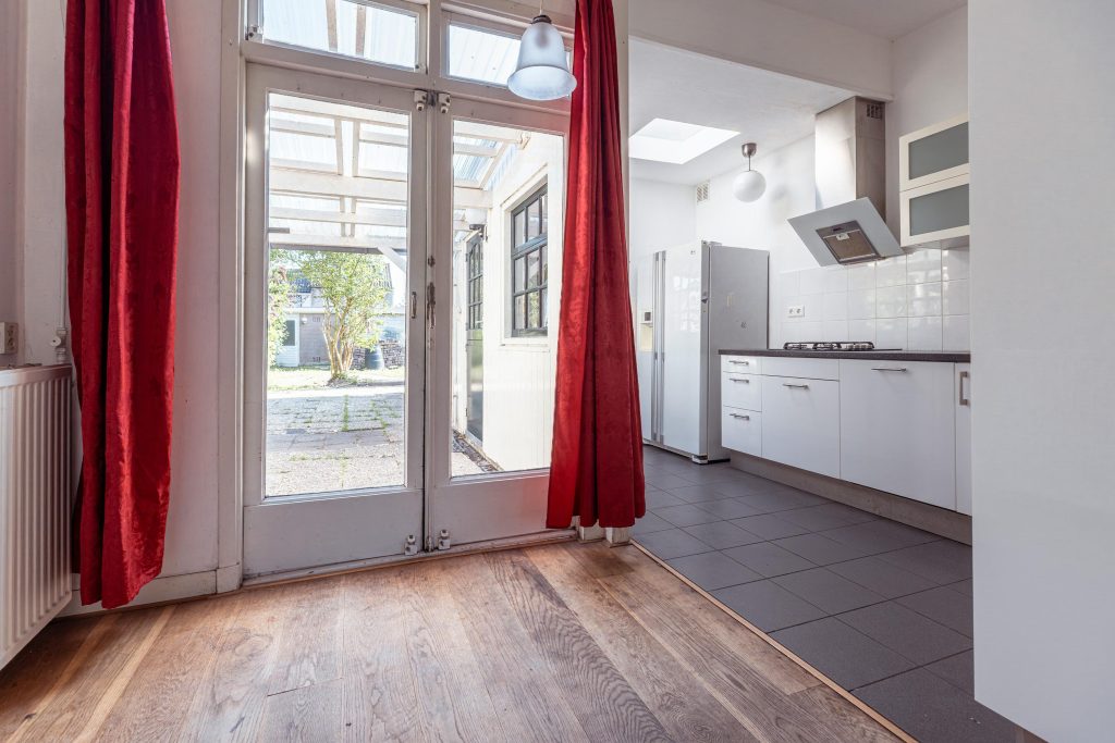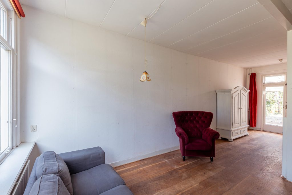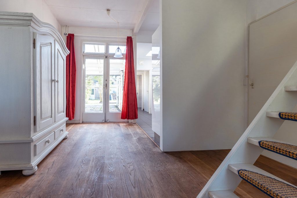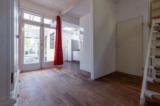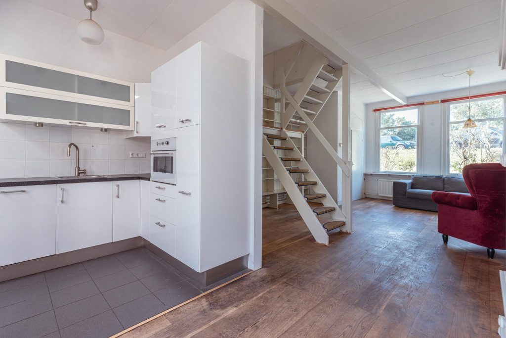 Entree aan de voorzijde met kleine hal. Vanuit de hal toegang tot de lichte woonkamer met uitzicht op de groene omgeving en de dijk aan de voorzijde. De woonkamer is ruim, met een hoog plafond, aan de achterzijde heeft de woonkamer openslaande deuren naar de tuin. De keuken is L-vormig en heeft een lichte kleurstelling, via de keuken kom je in een kleine hal met toegang tot de tuin en het toilet met fontein, aansluitend is er een extra hal en een bijkeuken, die eveneens toegang geeft tot de tuin.