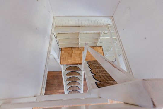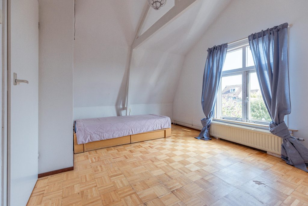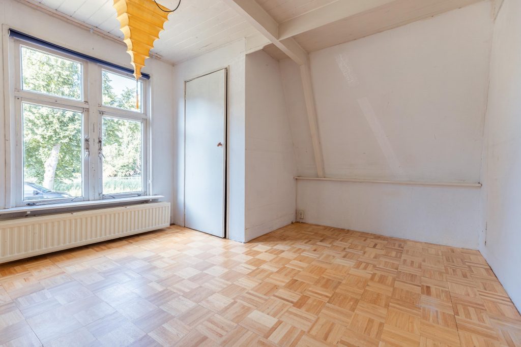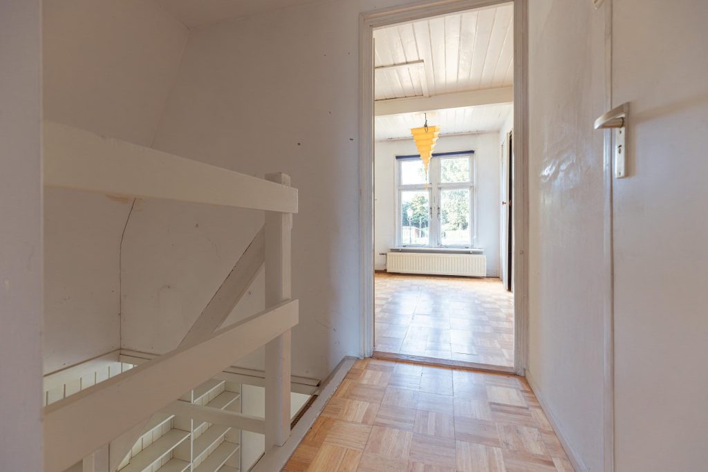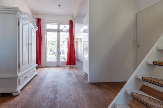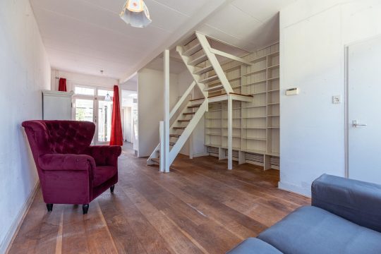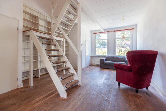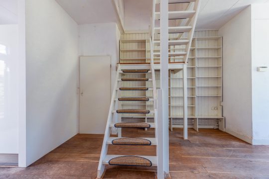 Vanuit de woonkamer de opgang naar de eerste verdieping. Overloop met toegang tot de twee slaapkamers en een kleine badkamer. De slaapkamer aan de voorzijde biedt vrij uitzicht over de Vecht en de tweede slaapkamer aan de achterzijde kijkt uit over de diepe tuin.