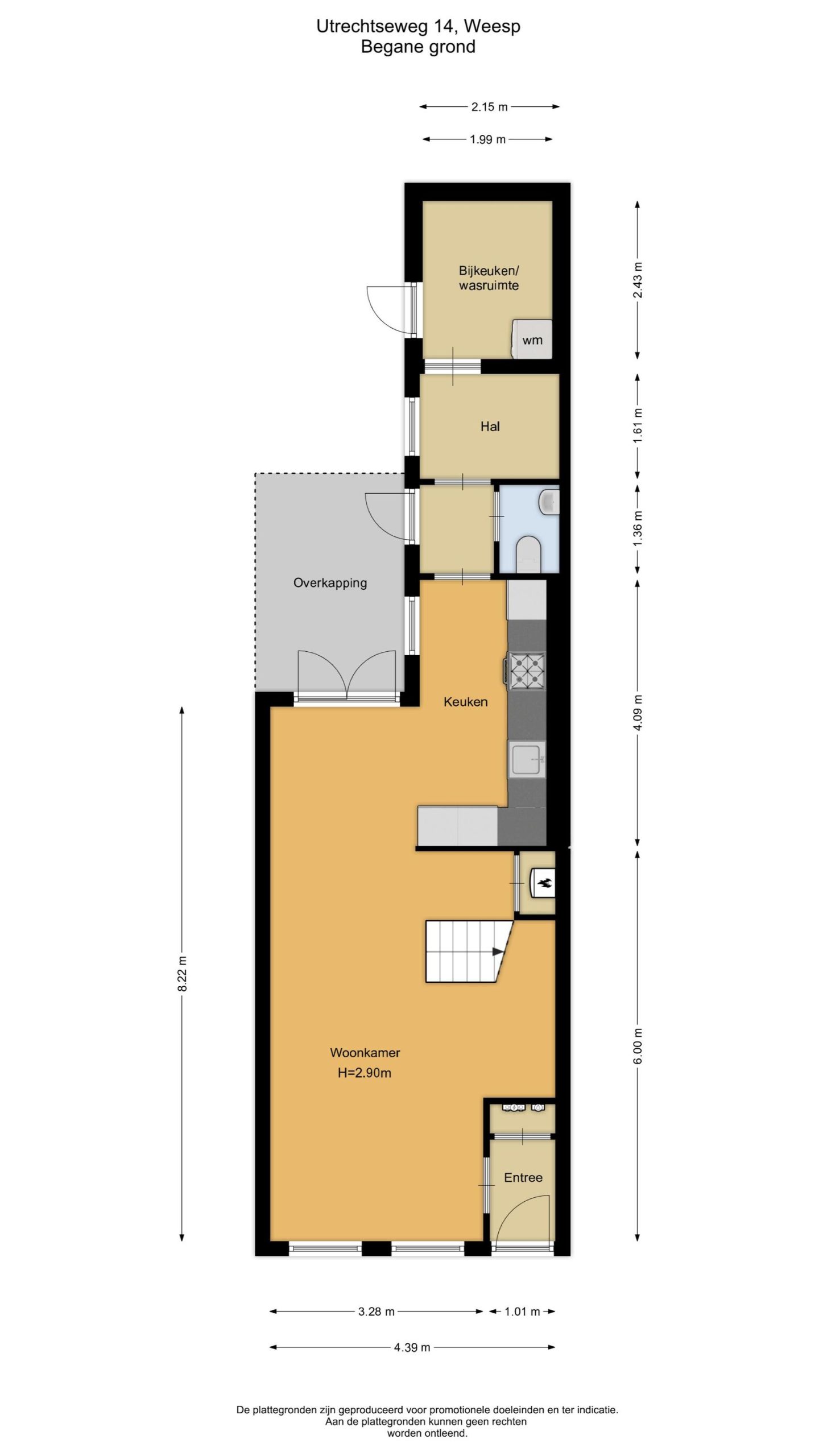 Entree aan de voorzijde met kleine hal. Vanuit de hal toegang tot de lichte woonkamer met uitzicht op de groene omgeving en de dijk aan de voorzijde. De woonkamer is ruim, met een hoog plafond, aan de achterzijde heeft de woonkamer openslaande deuren naar de tuin. De keuken is L-vormig en heeft een lichte kleurstelling, via de keuken kom je in een kleine hal met toegang tot de tuin en het toilet met fontein, aansluitend is er een extra hal en een bijkeuken, die eveneens toegang geeft tot de tuin.