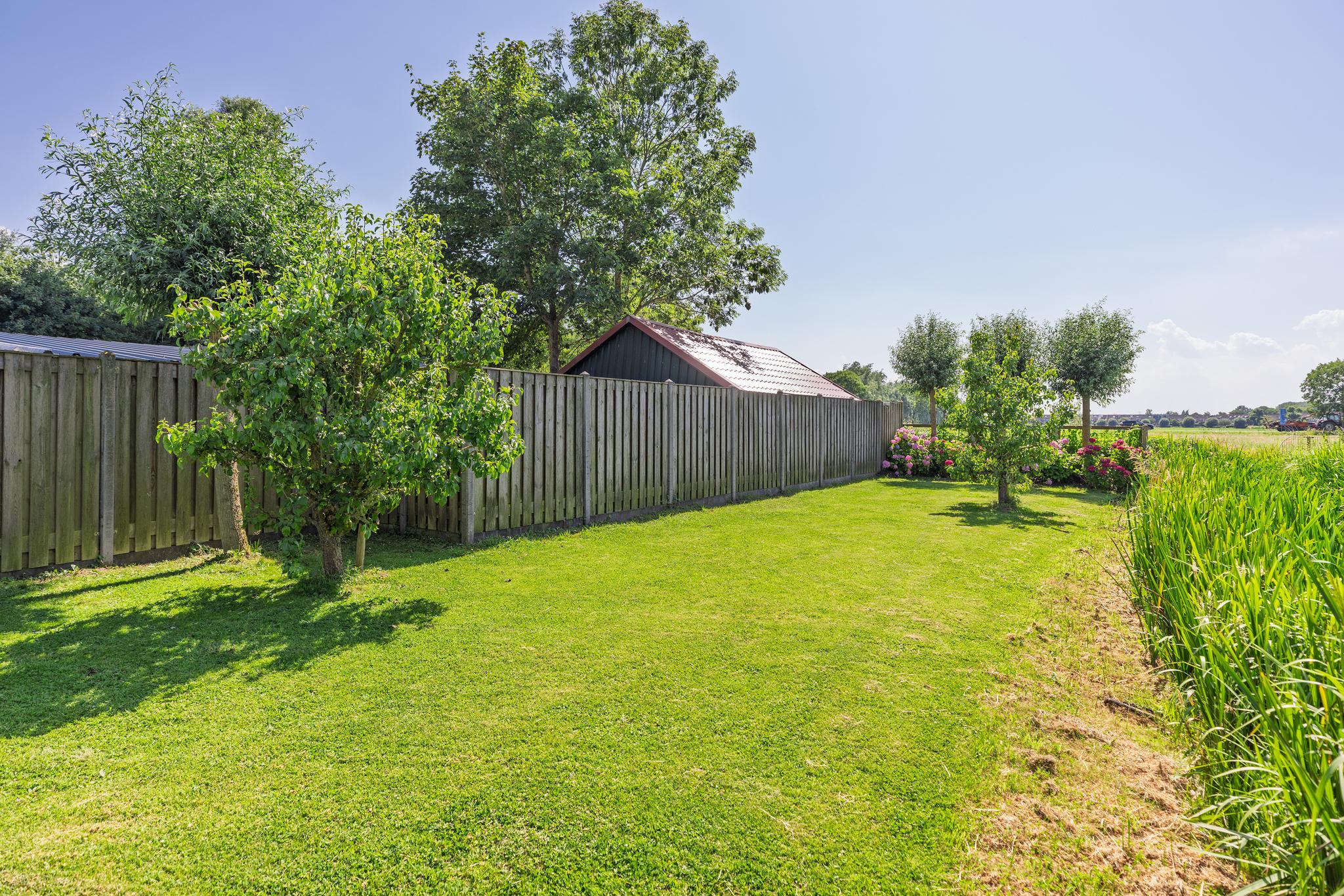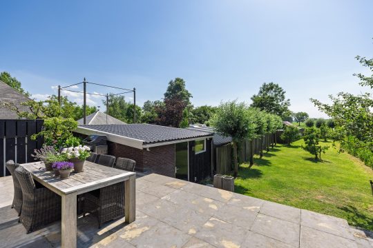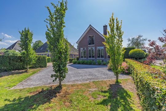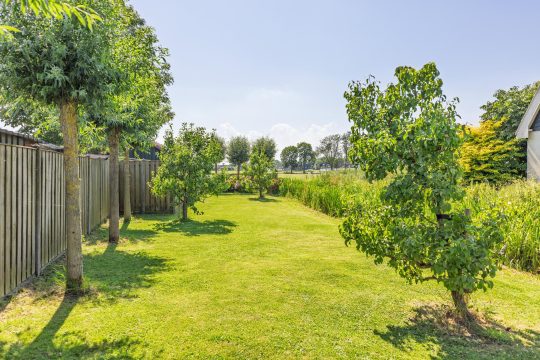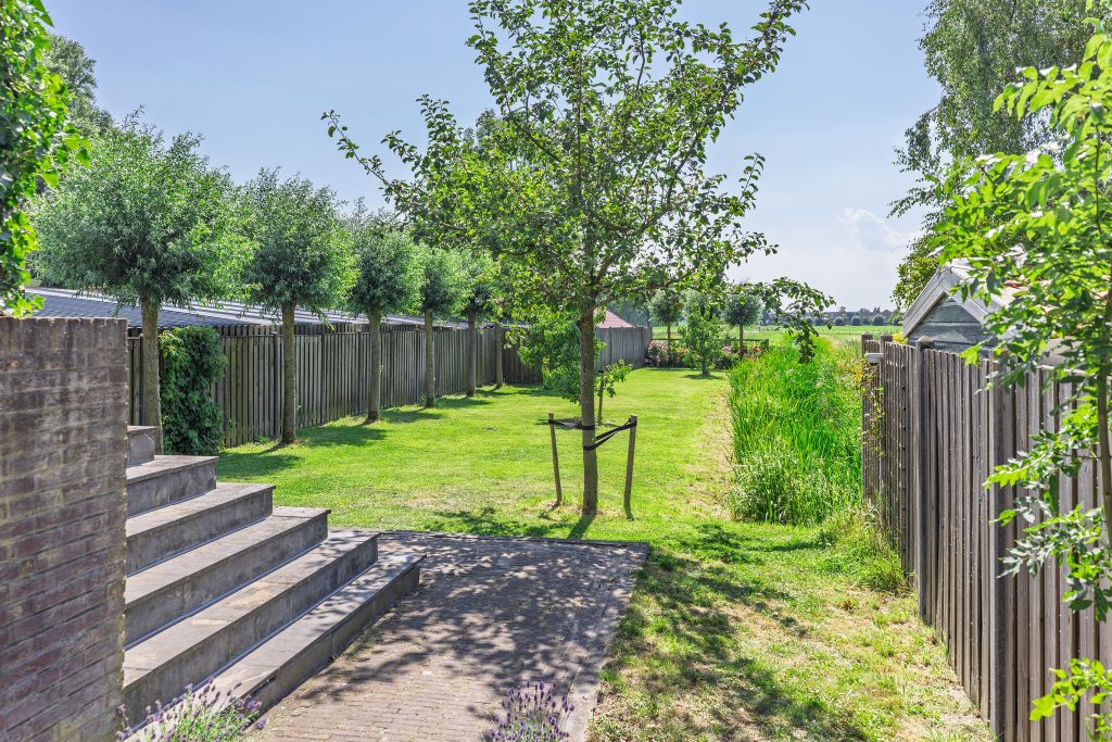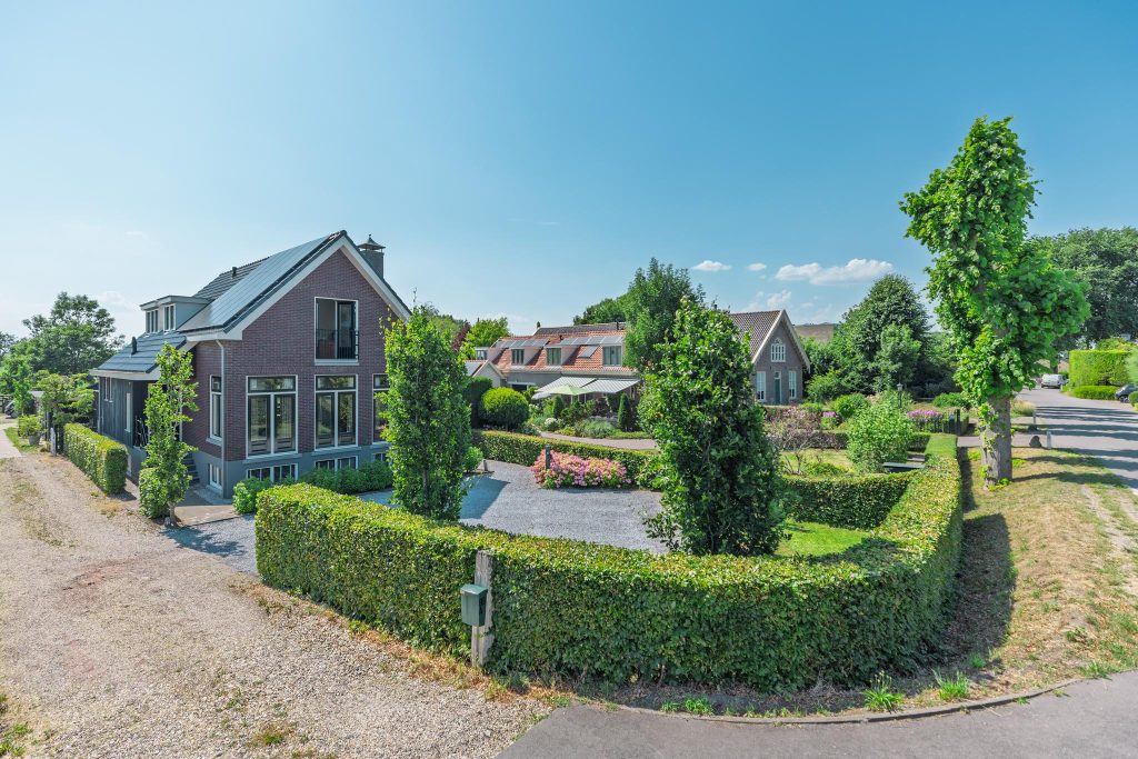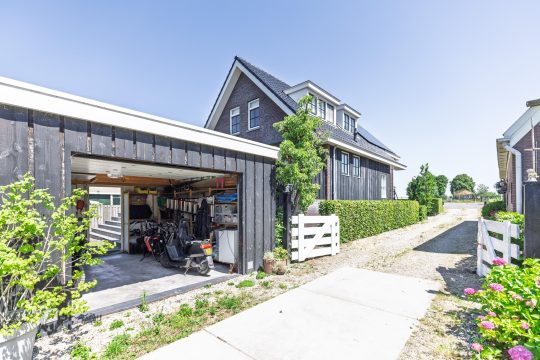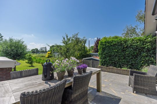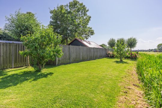 Aan de voorzijde bevindt zich de voortuin en zijn er minimaal 3 plekken om auto’s te parkeren, ook is er een laadpaal. Verder is er een grote garage van bijna 26 m². En dan natuurlijk de gigantische achter- (en zij-)tuin. Vanuit de woonkeuken start deze met een groot zonneterras, waar het heerlijk genieten is van het uitzicht op de weilanden en je eigen tuin.