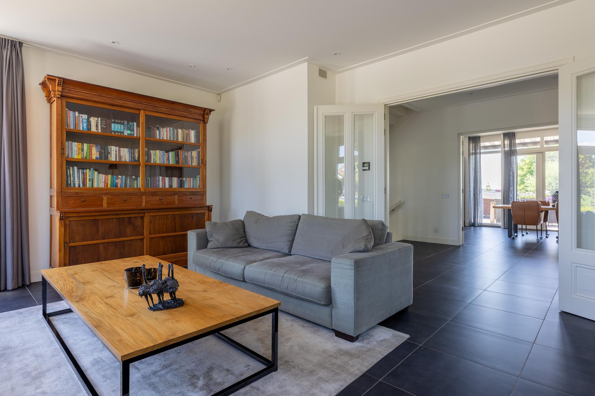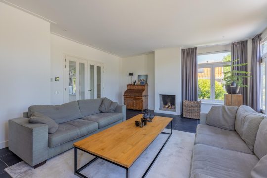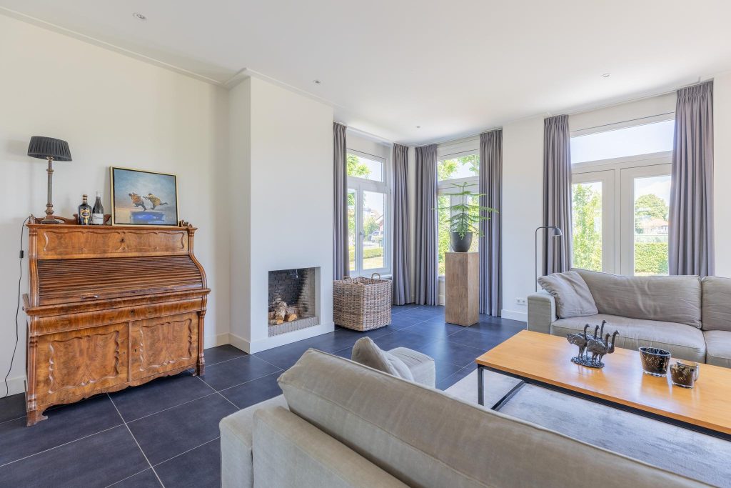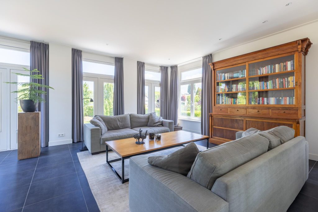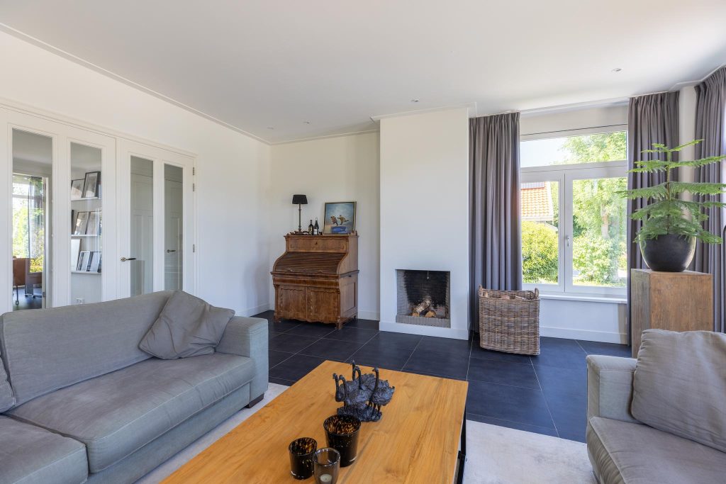 Dubbele deuren naar de ruime woonkamer aan de Vechtzijde voorzien van vele raampartijen en open haard.