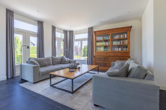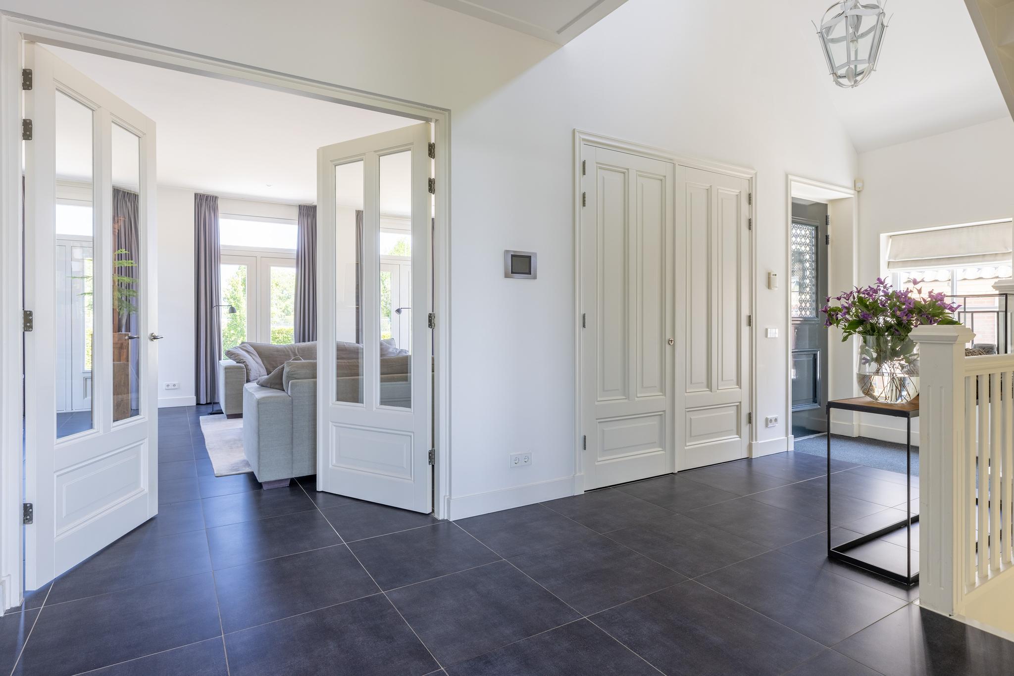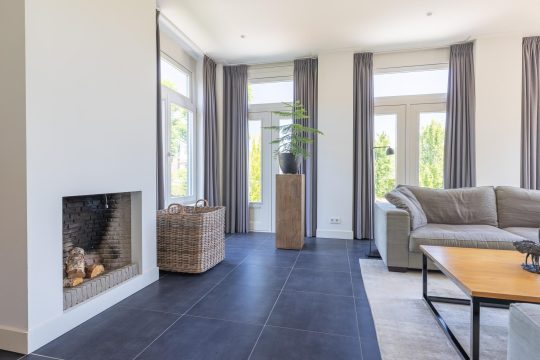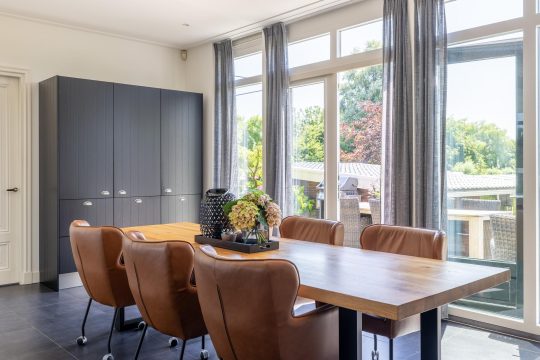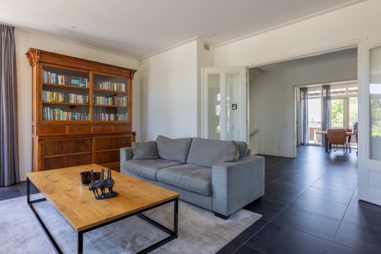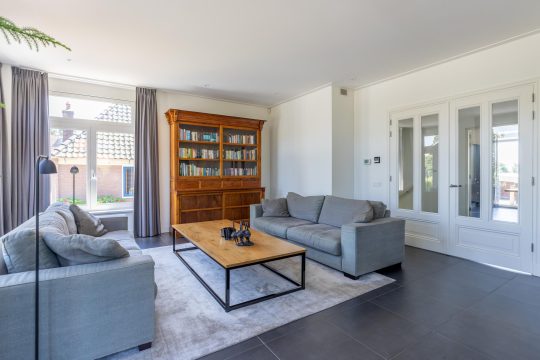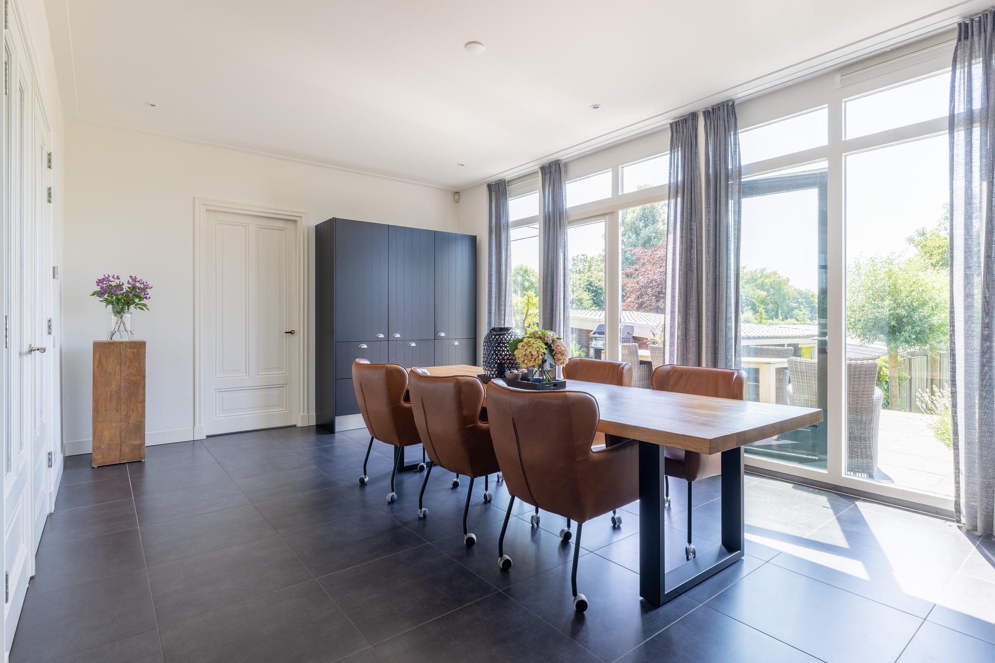Dubbele deuren naar de ruime woonkamer aan de Vechtzijde voorzien van vele raampartijen en open haard.