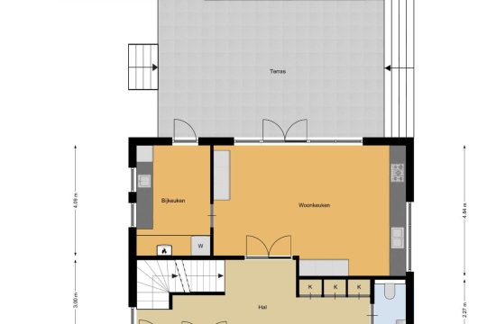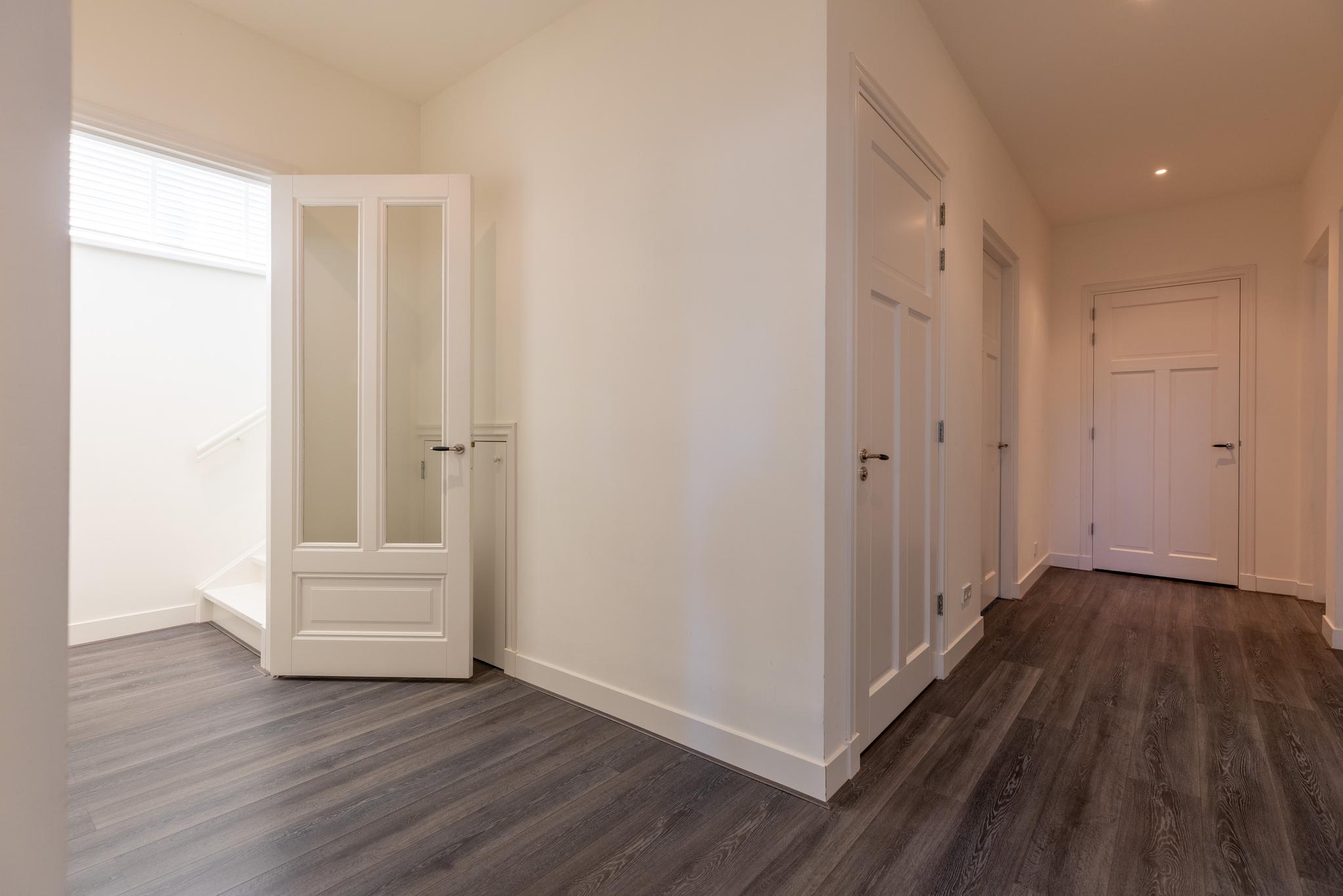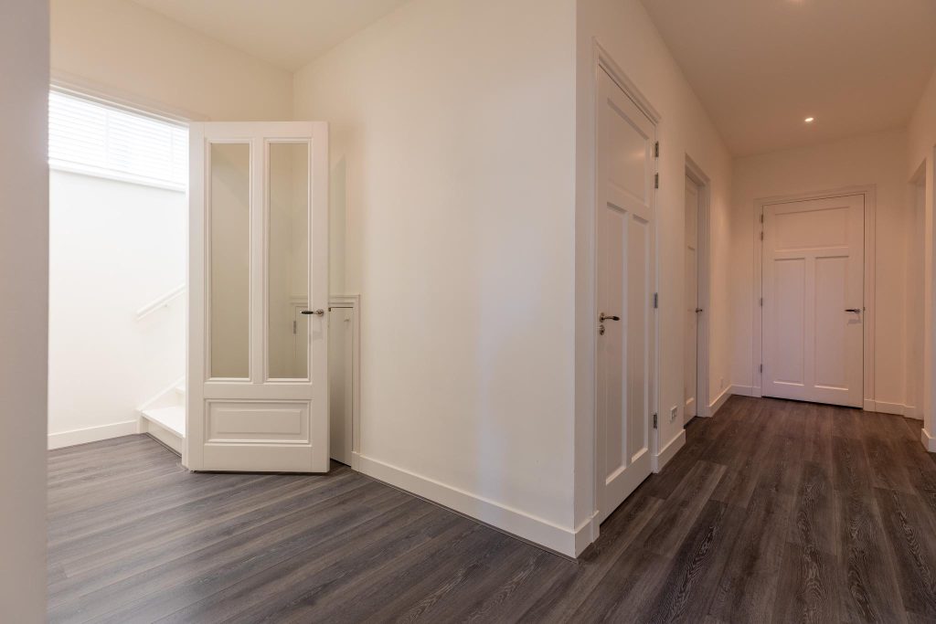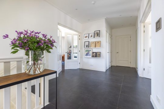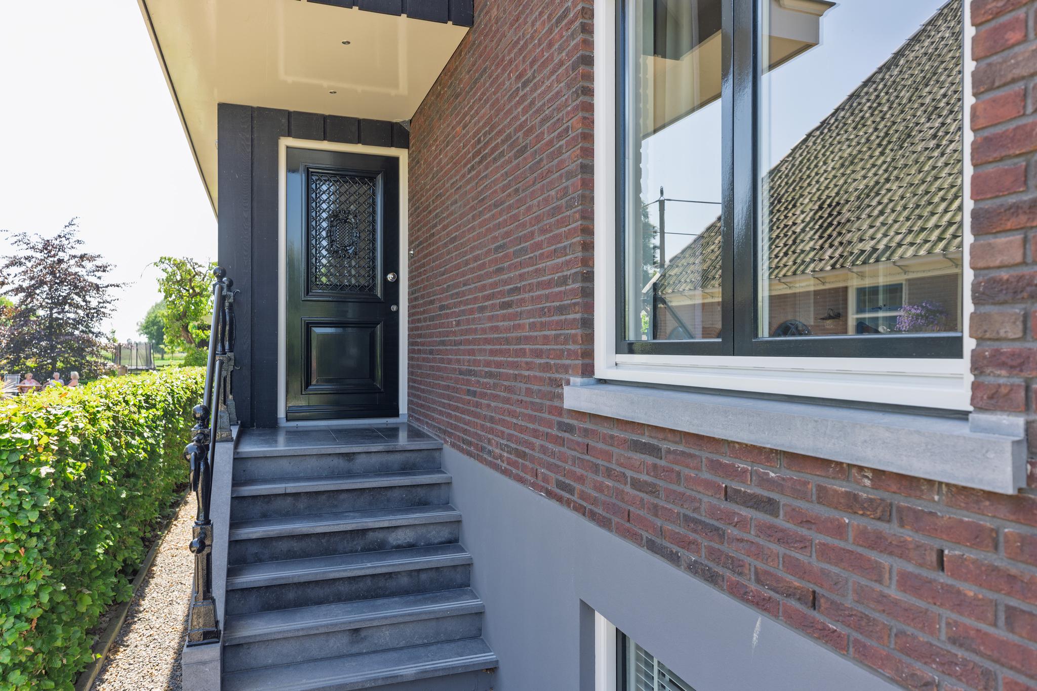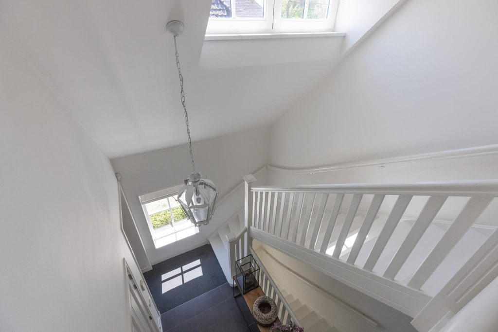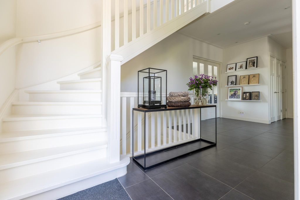 Trap naar overdekt entree met de toegang naar de zeer royale hal met meterkast, garderobe kasten, ruim toilet met fontein en prachtige trapopgang naar de eerste verdieping.