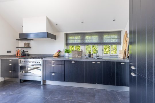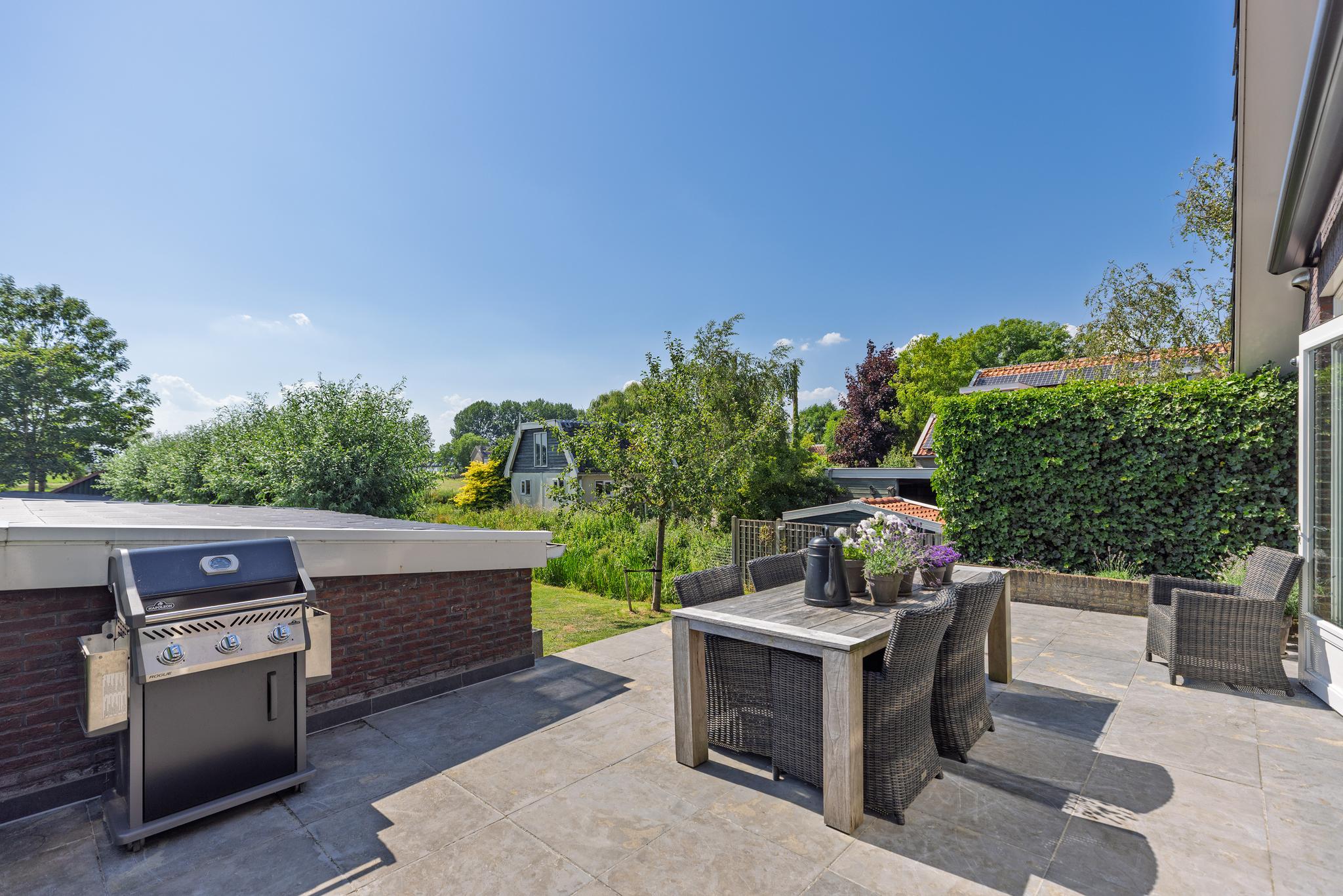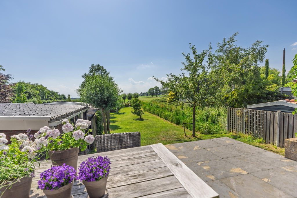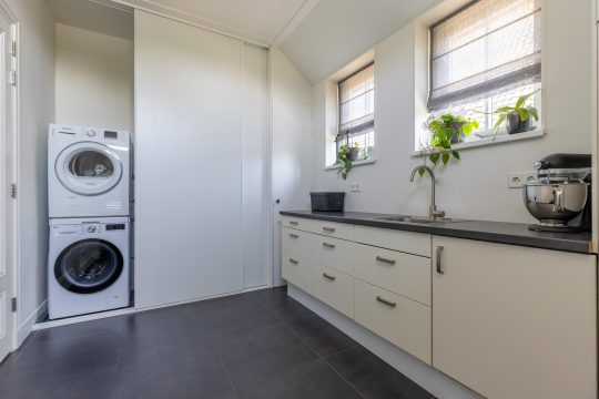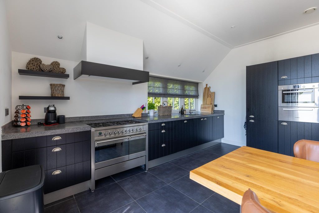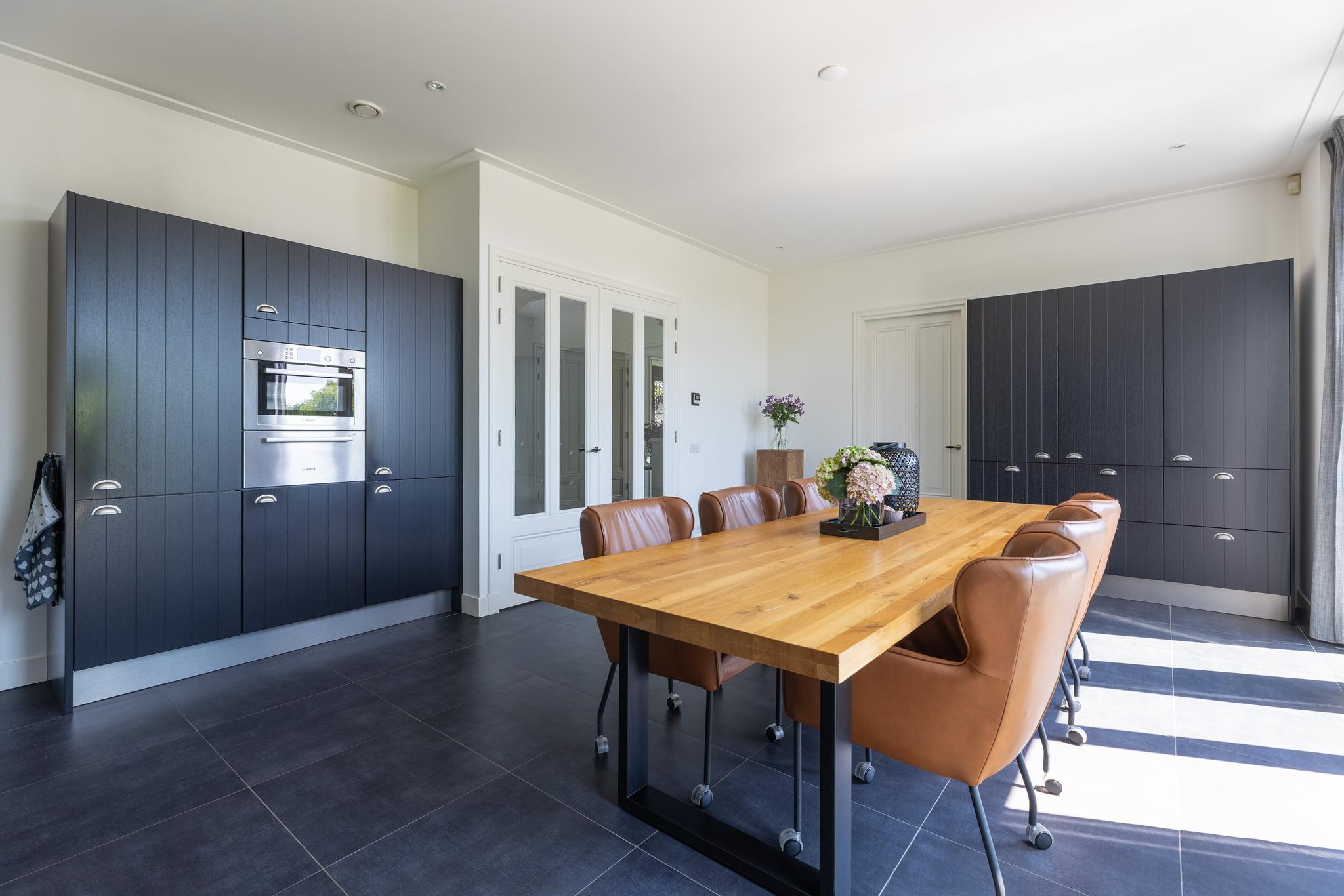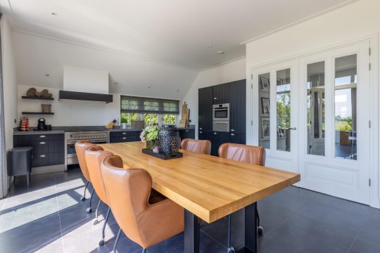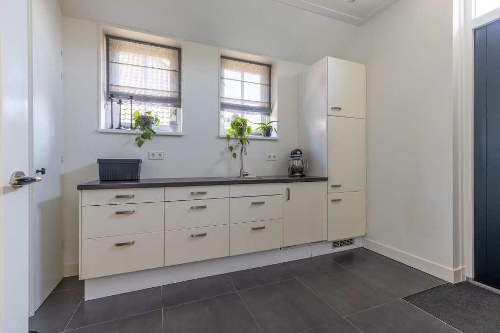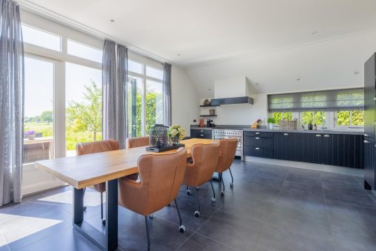 Vanuit de hal wederom dubbele deuren naar de grote landelijke woonkeuken met waanzinnig uitzicht over de eigen tuin en de weilanden. Het zonneterras en de tuin zijn te bereiken via de openslaande deuren. Via de keuken bereik je ook de bijkeuken met een groot keukenblok. De wasmachine/droger opstelling en de CV-ketel zijn mooi weggewerkt achter een schuifwandkast. Via de bijkeuken is eveneens het zonneterras en tuin te bereiken.