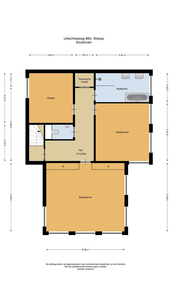 In het souterrain (hoogte: 3 meter) bevindt zich in de hal een derde separaat toilet met fontein en aan het einde van de hal een technische ruimte. Royale slaapkamer aan de voorzijde met mooie, op maat gemaakte inbouwkasten. Een vijfde en zelfs zesde slaapkamer bevinden zich eveneens op deze verdieping evenals de tweede badkamer voorzien van ligbad, inloopdouche en dubbel wastafelmeubel.